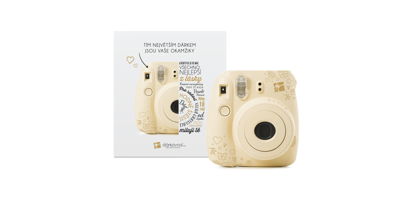 Pro Dárkovnu – specialisty na dárkové boxy, koše a všechny ty „wow“ momenty, jsme vytvořili brandový instantní fotoaparát v jejich ikonické zlaté barvě, doplněný o grafický pattern, který zákazníci znají z vizitek a dalších tiskovin. Jeho hlavní myšlenkou je, že tím největším dárkem je okamžik, který si můžeme uchovat. A rovnou vyvolat.